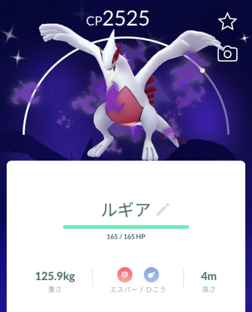 ちなみにこのルギアの個体値…見た感じハイパーリーグ向きっぽい構成になっていますが、ブーストが掛かってしまいCPが高くなりすぎてしまった模様。残念!(それでもシャドウルギアは色違い初入手なので嬉しいですね!)